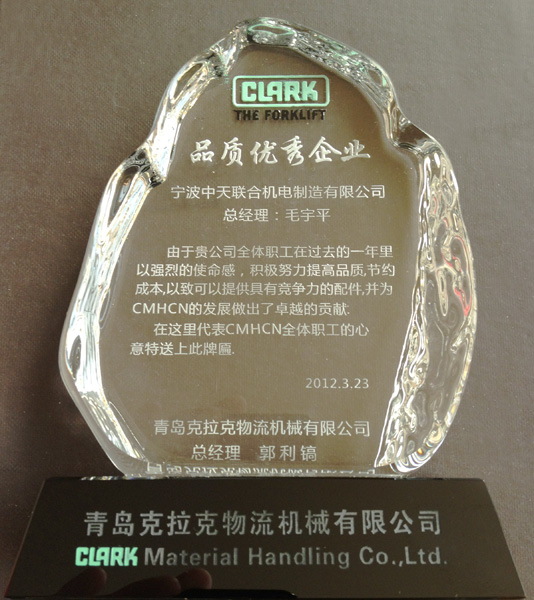 在本月召開的青島克拉克物流機械有限公司供應商會議中,中天公司在30多家供應商中憑借優(yōu)秀的質(zhì)量、成本及交貨率被評為品質(zhì)優(yōu)秀企業(yè)。此次會議共設兩名優(yōu)秀供應商,中天公司為獲得此殊榮的兩家企業(yè)之一。